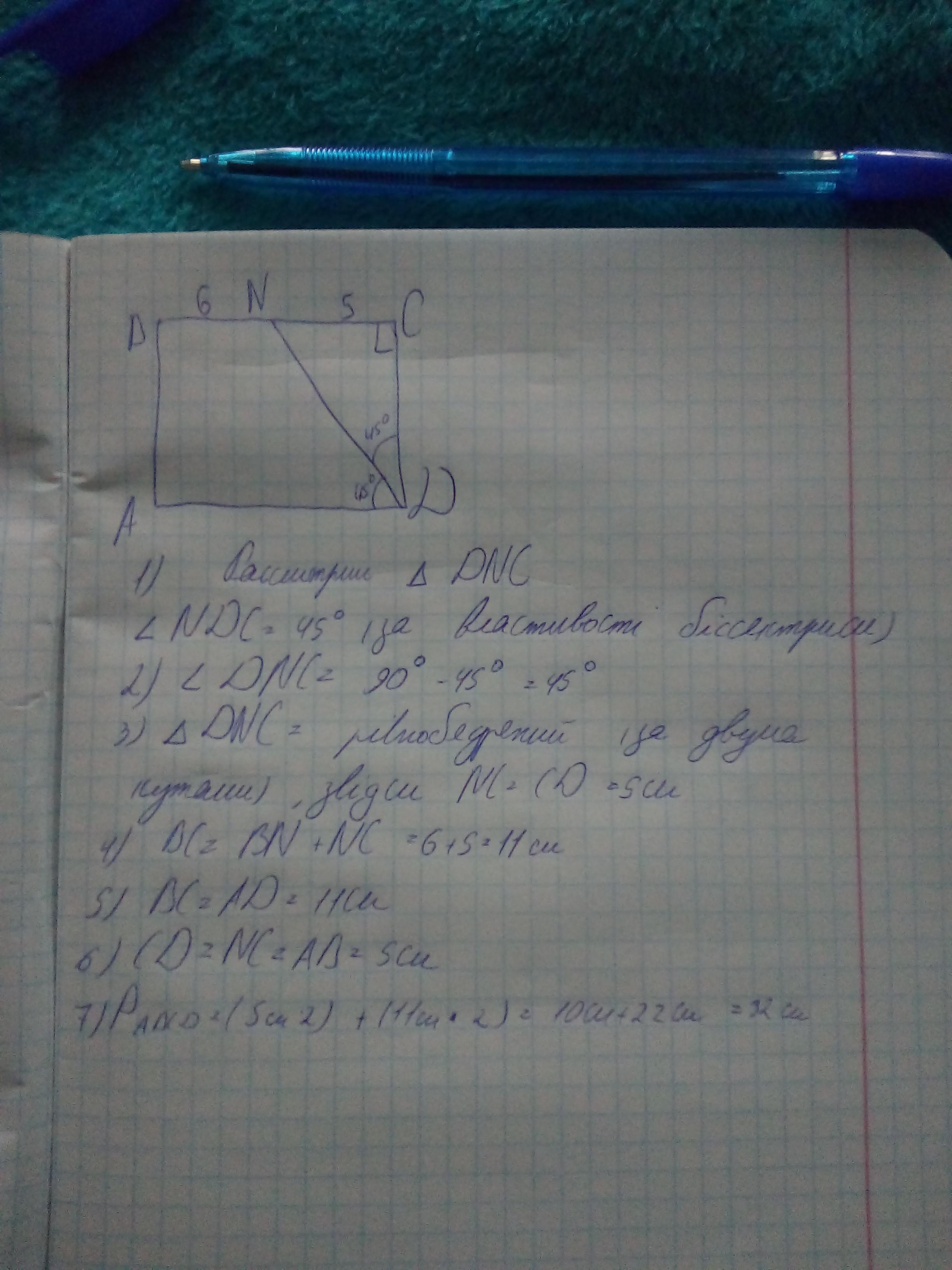 у прямокутнику ABCD бисектриса DN прямого кута D ділять протилежну сторону на відрізки CN и BN які дорівнюють 6 см і 5 см відповідно. знайдіть периметр прямокутника. РЕШЕНИЕ!!!!!