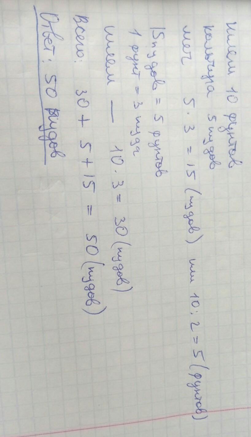 Шлем весит 10 фунтов. Кольчуга 5 пудов,а меч в 3 раза больше,чем кольчуга,но в 2 раза меньше, чем шлем.Сколько всего фунтов носил на себе древний рыцарь?