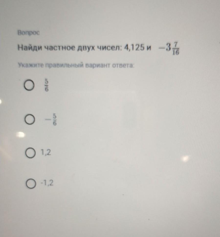 Объяснение:4,125:(-3 7/16)= -4 1/8:3 7/16= - 33/8 :55/16= - (33·16)/(8·55)=