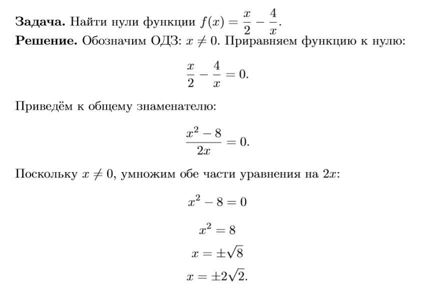 Приравняем выражение к нулю: x/2-4/x=0. Приведём к общему знаменателю: (x^2-8) / (2x) = 0. Учитывая, что икс не может равняться нулю, умножим выражение на 2x: