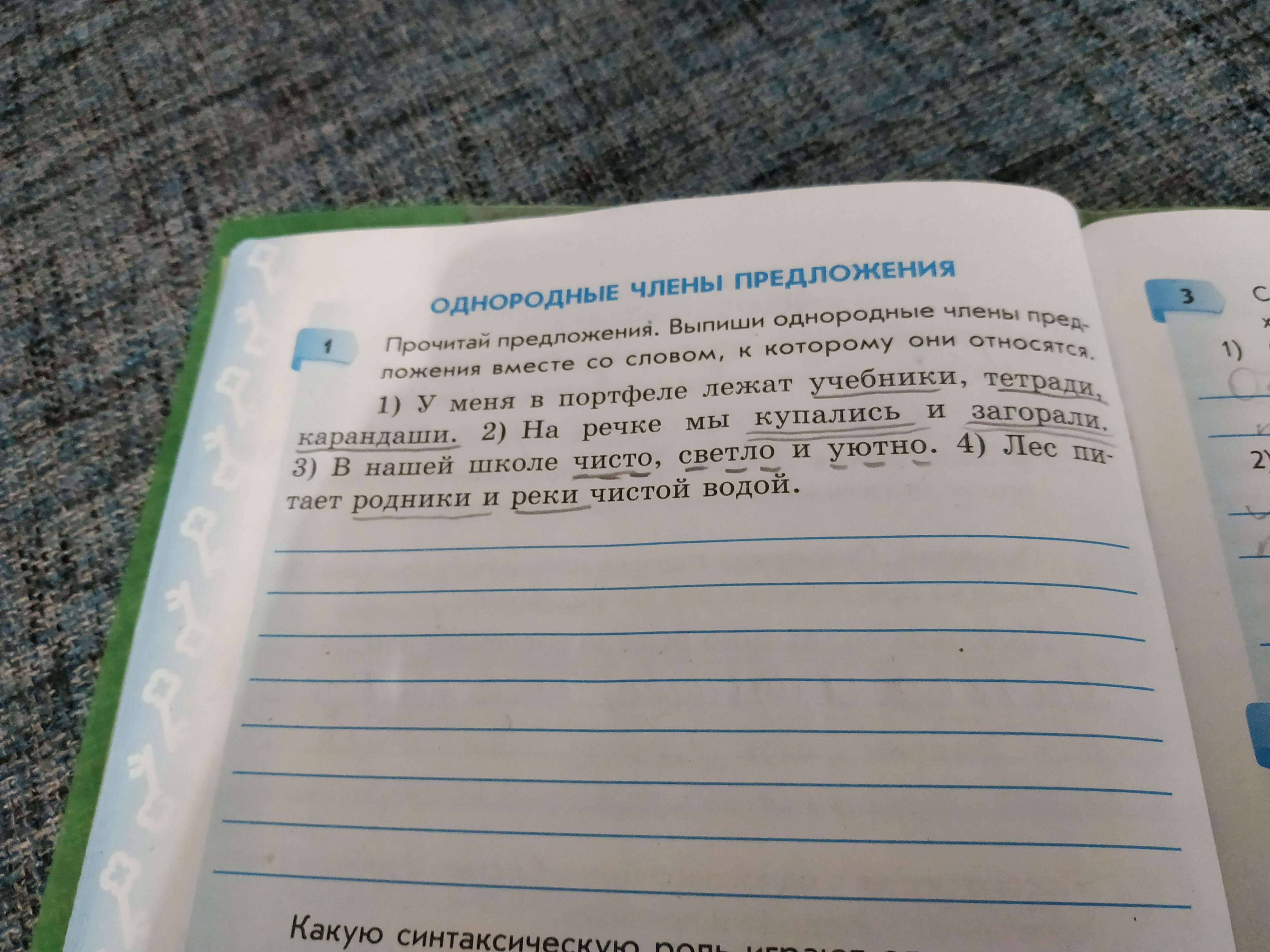 Ответ:Учебники,тетради,карандаши ЛЕЖАТ.Купались и загорали МЫ.Чисто,светло и уютно В ШКОЛЕ.Родники и реки ЛЕС ПИТАЕТ.