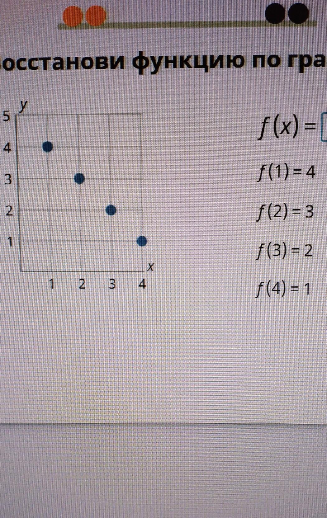 Ответ: у=5-х. Видно, что функция уменьшается с од наковой скоростью под углом 45 градусов к отрицательно у напрвлению, то есть она линейная и имеет вид k*x+b. Тогда 4=-1*1+b или b=5.