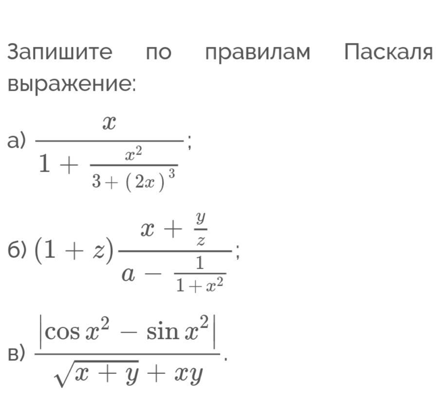 в) abs(cos(x*x)-sin(x*x))/(sqrt(x+y)+x*y)