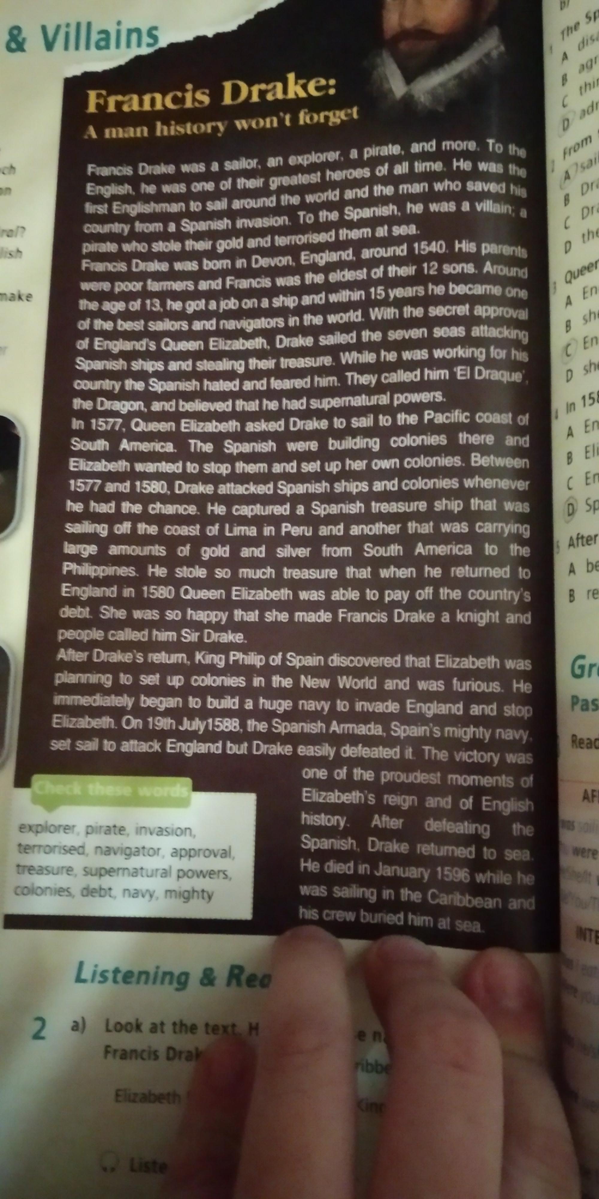 Фрэнсис Дрейк: история человека не забудет Фрэнсис Дрейк был моряком, исследователем, пиратом и многим другим. Для англичан он был одним из их величайших героев всех времен. Он был первым англичанином, совершившим кругосветное плавание, и человеком, который спас страну от испанского вторжения. Для испанцев он был злодеем-пиратом, который украл их золото и терроризировал их в море. Фрэнсис Дрейк родился в Девоне в Англии около 1540 года. Его парни были бедными фермерами, а Фрэнсис был старшим из их 12 сыновей. В возрасте 13 лет он получил работу на корабле и в течение 15 лет стал одним из лучших моряков и мореплавателей в мире. С тайного одобрения английской королевы Елизаветы Дрейк плыли семь морей, нападая на испанские корабли и крадя их сокровища. Пока он работал в своей стране, испанцы ненавидели его и боялись. Они назвали его Эль-Драконом-Драконом и считали, что он обладает сверхъестественными способностями. В 1577 году королева Елизавета попросила Дрейка отплыть к Тихоокеанскому побережью Южной Америки. Испанцы строили там колонии, и Элизабет хотела остановить их и создать свои собственные колонии. Между 1577 и 1580 годами Дрейк атаковал испанские корабли и колонии всякий раз, когда у него был шанс. Он захватил испанский корабль сокровищ, который плыл у побережья Лимы в Перу, и еще один, который перевозил большое количество золота и серебра из Южной Америки на Филиппины. украл столько сокровищ, что, вернувшись в Англию в 1580 году, королева Елизавета смогла расплатиться с долгами страны. Она была так счастлива, что сделала Фрэнсиса Дрейка рыцарем, и люди называли его сэр Дрейк. После возвращения Дрейка король Филипп Филипп обнаружил, что Элизабет планирует создать колонии в Новом Свете и был в ярости. Он немедленно начал строить огромный флот, чтобы вторгнуться в Англию и остановить Элизабельт. 19 июля 1588 года Испанская армада, могучий флот Испании, отплыла в Англию, но Дрейк легко победил ее. Победа была одним из самых гордых моментов правления Елизаветы и истории Англии. Испанский Дрейк вернулся в море. Он умер в январе 1596 года, когда плавал в Карбане, и его команда похоронила его в море. После победы над