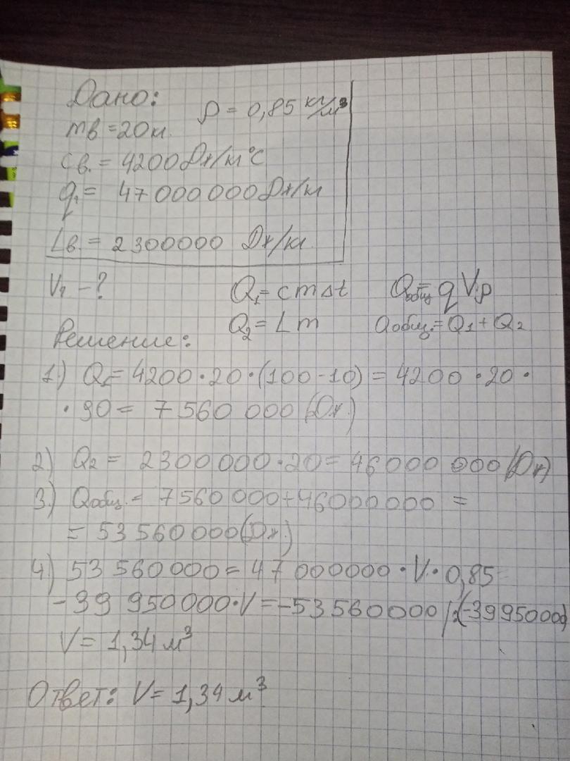 4.) По формуле Q=m*q где q - удельная теплота сгорание, а m - масса, составим уравнение: 53 560 000=V*0,85*47 000 000