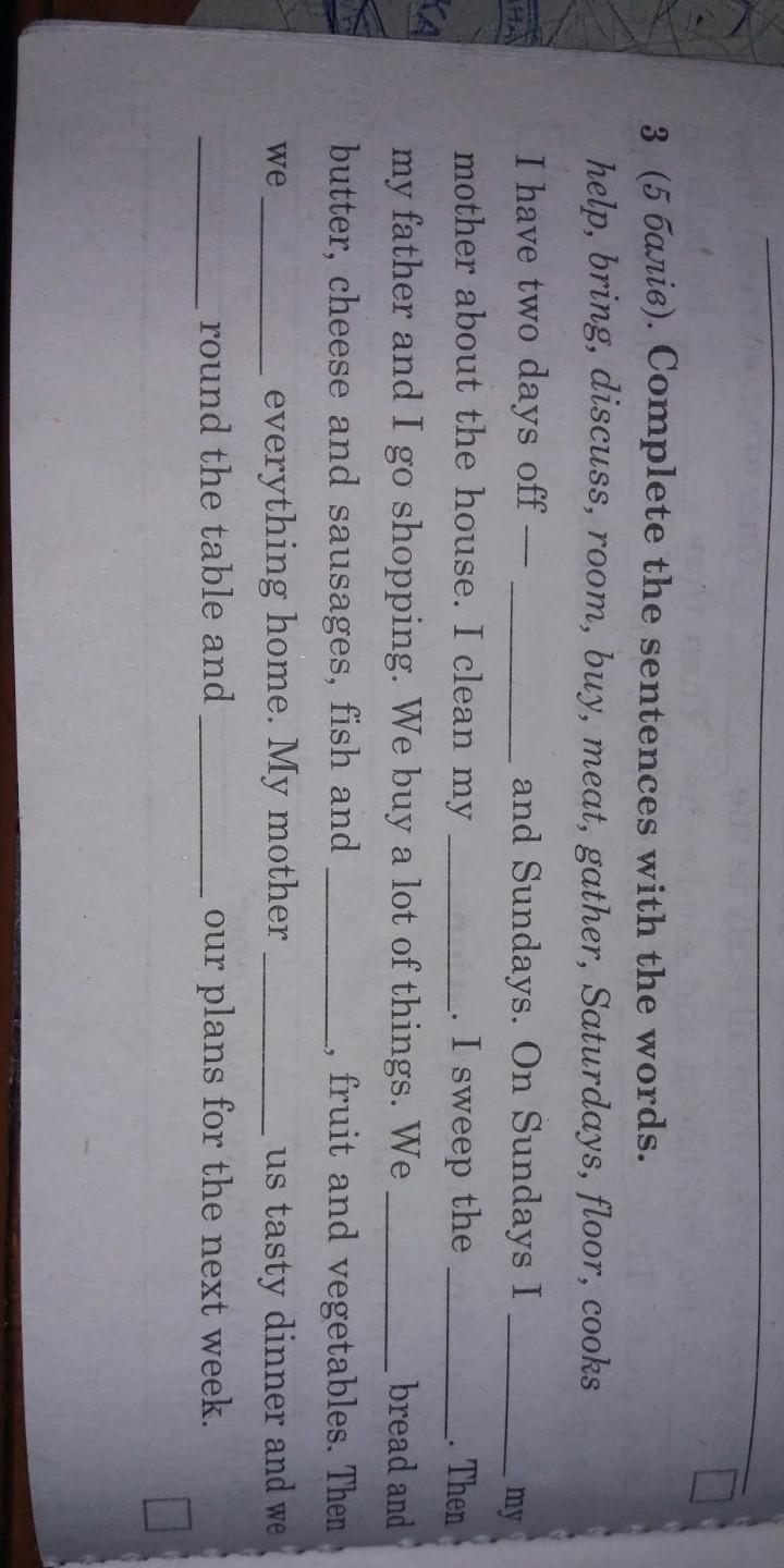 I have two days off - Saturdays and Sundays. On Sunday I help my Mother about the house. I clean my room. I sweep the floor. The my father and I go shopping. We buy a lot of things. We buy bread and butter, cheese and sausages, fish and Meat, fruit and vegetables. Then we gather everything home. My Mother cooks us tasty dinner and we bring round the table and discuss our plans for the next week.