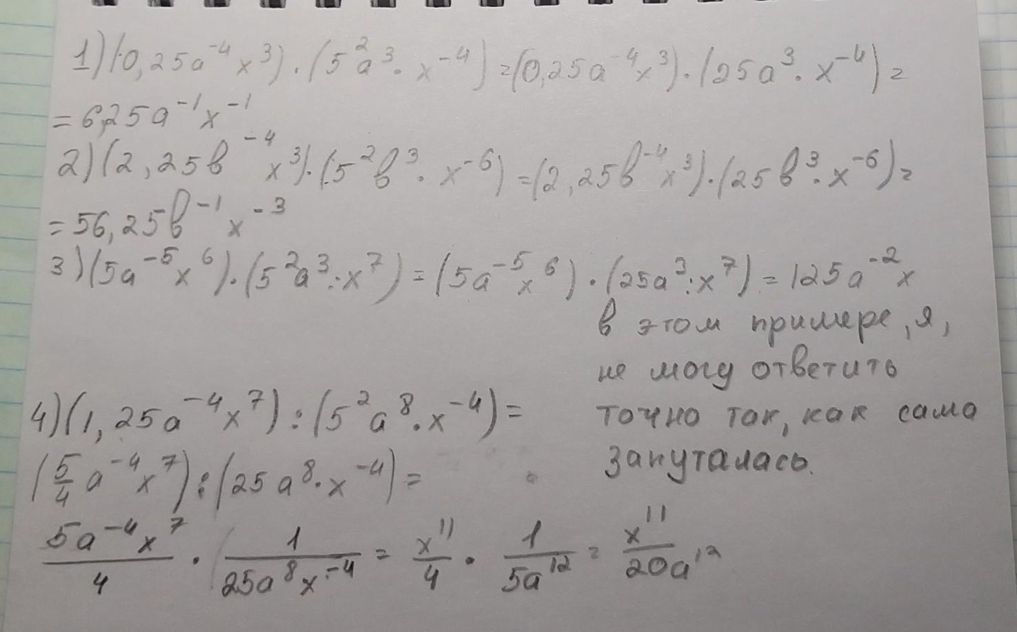 в 3) примере X^-1 в ответе , в 4) Ответ 0,05a^-12*x^11 там просто показатели степеней отнимаешь