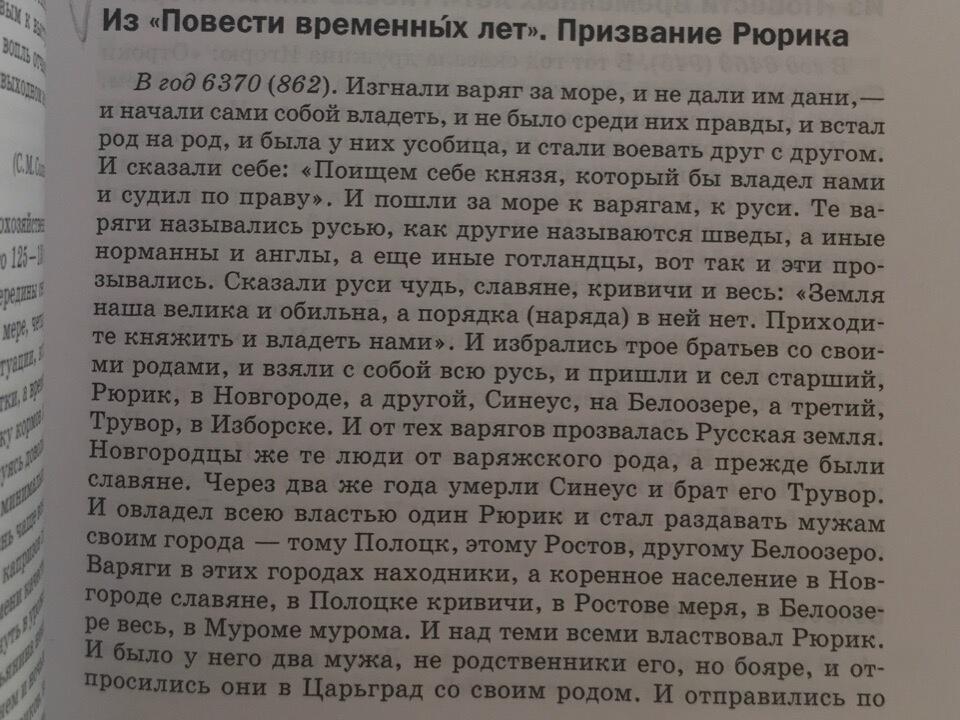 изгнали славяне варяг, не дав им дани, и начали сами собой править. правили они кто как мог. у одних получалось лучше, у других хуже, но порядка у них всех одинаково не было. брат на брата с войной шёл, не было среди них правды. и вот решили они найти себе князя. что бы княжил над ними. и пошли они к варягам за море. и сказали «земля наша велика и обильна, а порядка в ней нет. Приходите княжить и владеть нами». подумали варяги, и решили. к славянам пойдут три брата. старший - Рюрик, в Новгороде править будет. Синеус - на Белоозере. а третий, Трувор, на Изборске. правили братья так 2 года. а после Трувор и Синеус умерли, вот и овладел всей властью Рюрик. земли братьев, и оставшиеся он мужам (помощникам) своим раздавал. и над теми всеми властвовал Рюрик. последним Рюриком на русском престоле стал Федор Иоаннович.