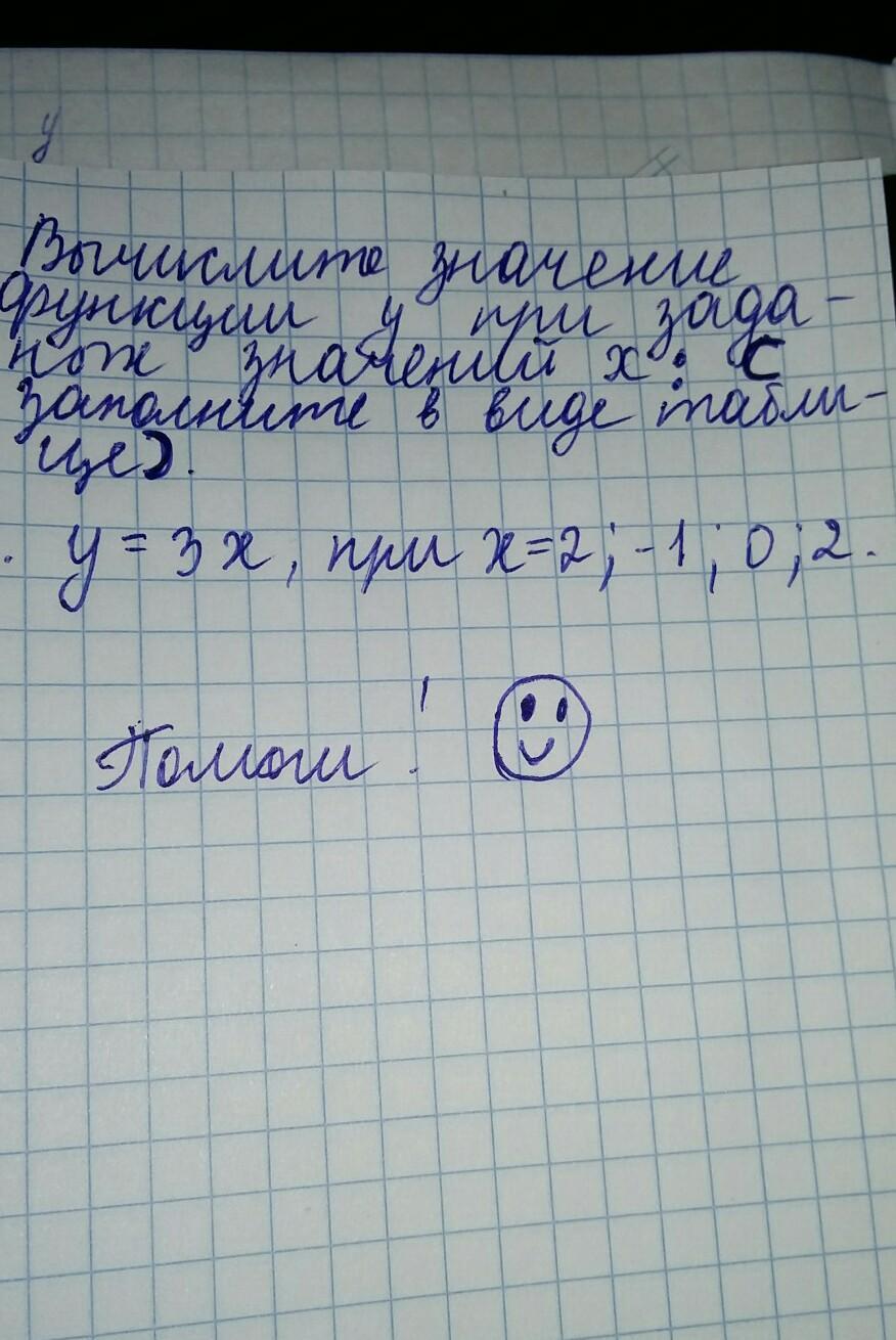 Вычислите значение функции y при заданых значение x÷(заполните в виде таблицы ) 1.y=3x, при x=2;-1;0;2