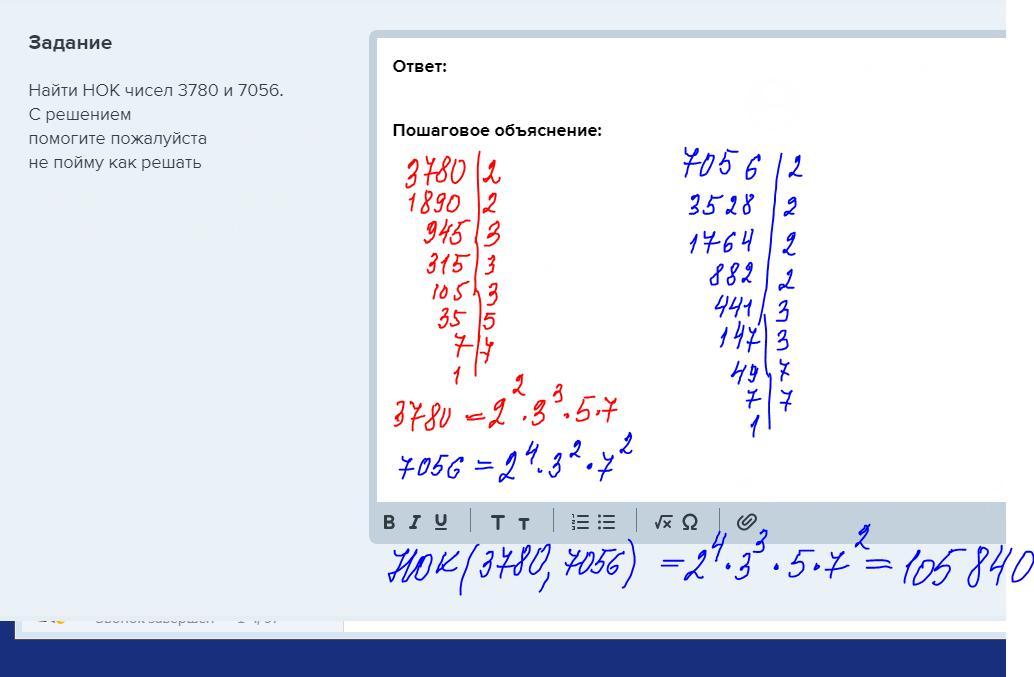 НОК(3780, 7056) = 2 * 2 * 2 * 2 * 3 * 3 * 3 * 5 * 7 * 7 = 105840