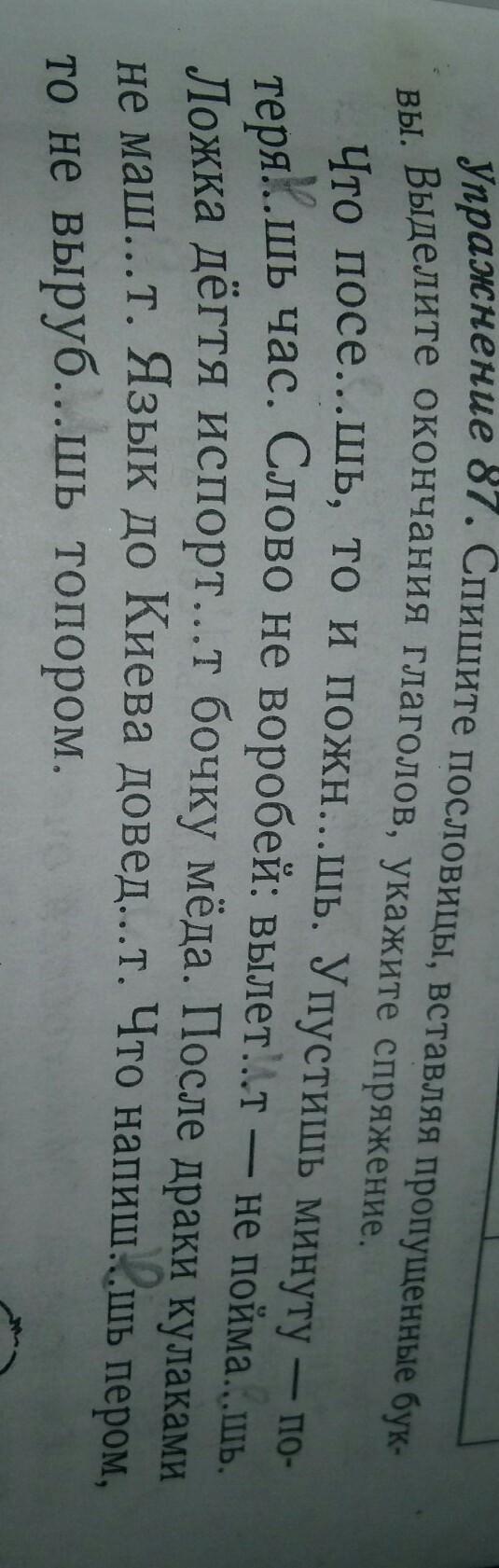 Упр87 Спишите пословицы вставляя пропущенные буквы выделите окончания глаголов укажите спряжение
