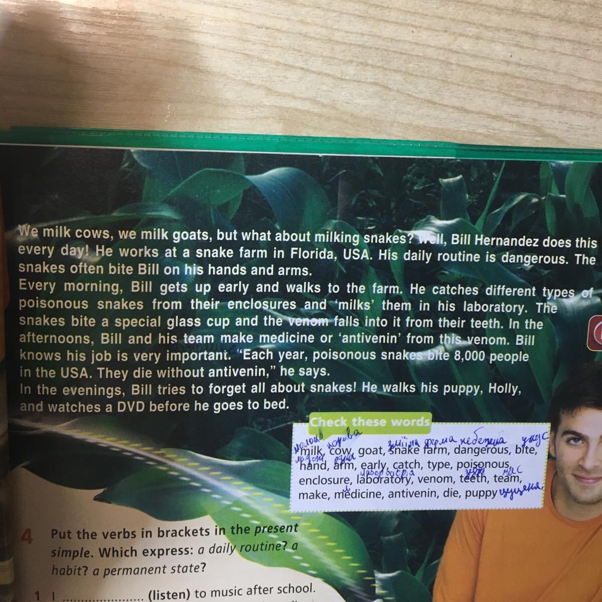 Мы доим коров, мы доим коз, но как насчет доения змей? Билл Эрнандес делает это каждый день! Он работает на змеиной ферме во Флориде, США. Его распорядок дня опасен. Змеи часто кусают Билла за руки. Каждое утро Билл встает рано и идет на ферму. Он ловит различные виды ядовитых змей из их вольеров и «доит» их в своей лаборатории. Змеи кусают специальную стеклянную чашку, и яд падает в нее из зубов. Во второй половине дня Билл и его команда делают лекарства или «противоядие» из этого яда. Билл знает, что его работа очень важна. «Каждый год ядовитые змеи уничтожают 8000 человек в США. Они умирают без противоядия», - говорит он. По вечерам Билл пытается забыть все о змеях! Он гуляет со своим щенком Холли и смотрит DVD перед тем, как лечь спать.