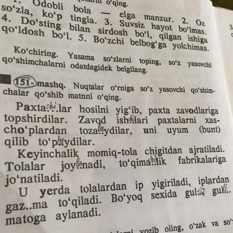 Keyinchalik momiq-tola chigitdan ajratiladi .Tolalar joylanadi , to'qimachilik fabrikalariga jo'natipadi .