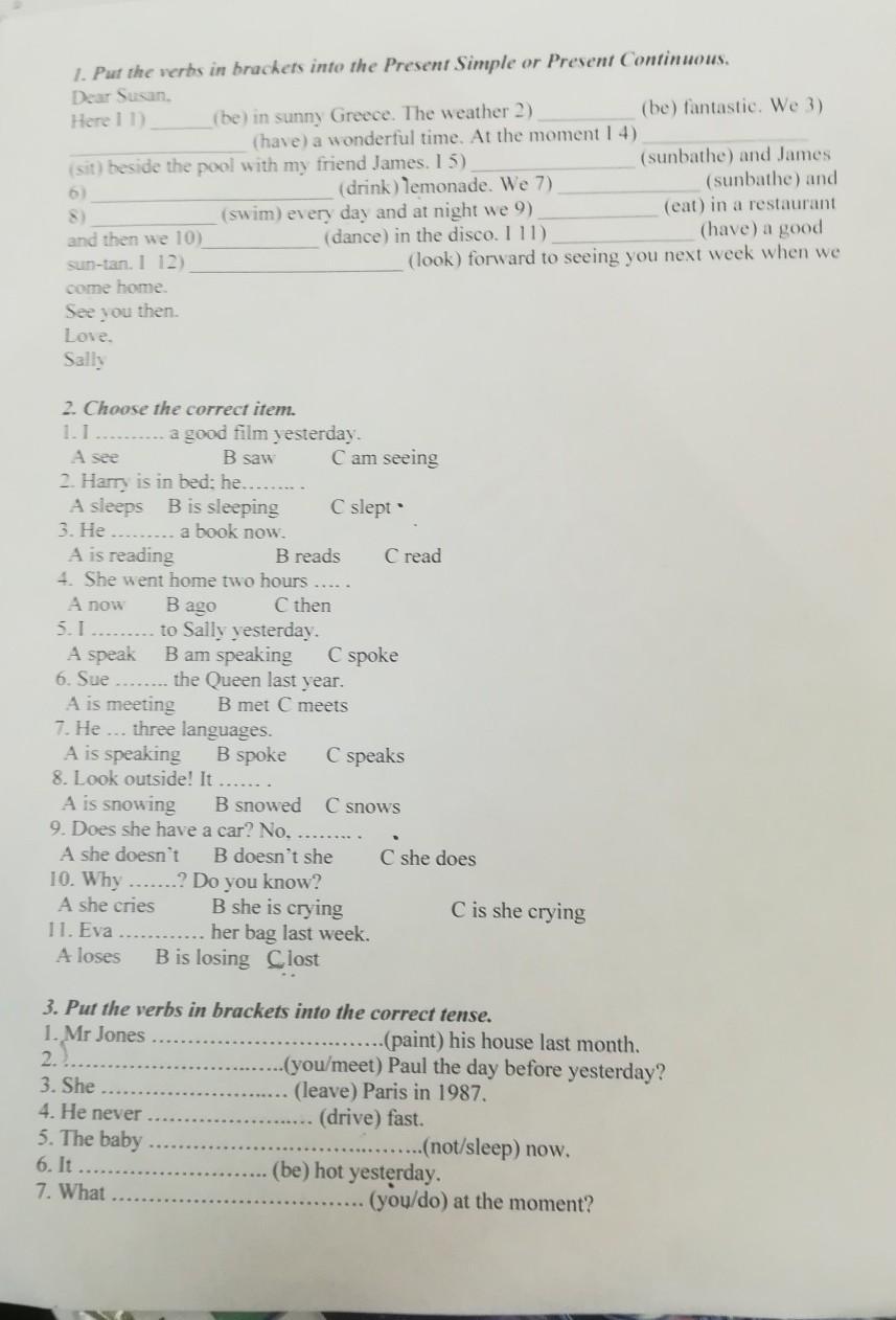 1) painted; 2) Did you meet; 3) She left Paris; 4) drives; 5) is not sleeping; 6) was; 7) are you doing.