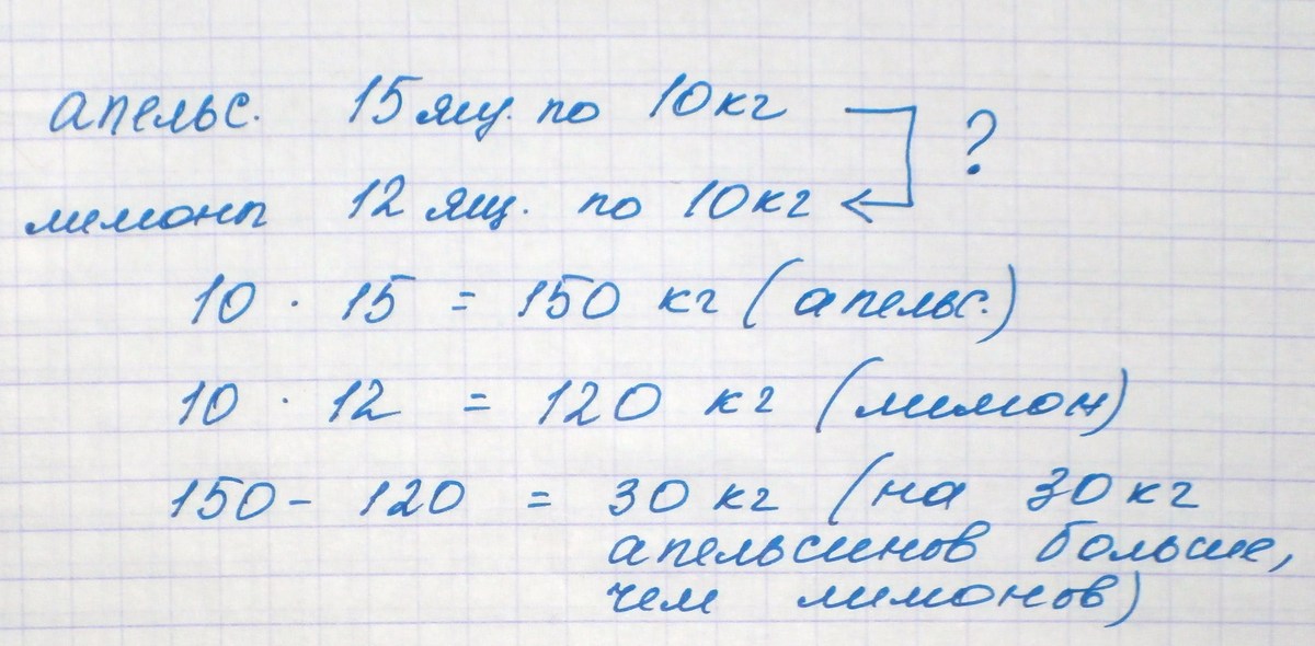 нарисуй схему(рисунок)к задаче.реши задачу.у продавца 15 ящиков с апельсинами и 12 ящиков с лимонами.масса каждого ящика 10 кг.на сколько килограммов апельсинов больше,чем лимонов?