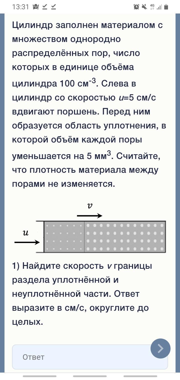 Цилиндр заполнен материалом с множеством однородно распределённых пор, число которых в единице объёма цилиндра 100 см-3. Слева в цилиндр со скоростью u=5 см/c вдвигают поршень. Перед ним образуется область уплотнения, в которой объём каждой поры уменьшается на 5 мм3. Считайте, что плотность материала между порами не изменяется.