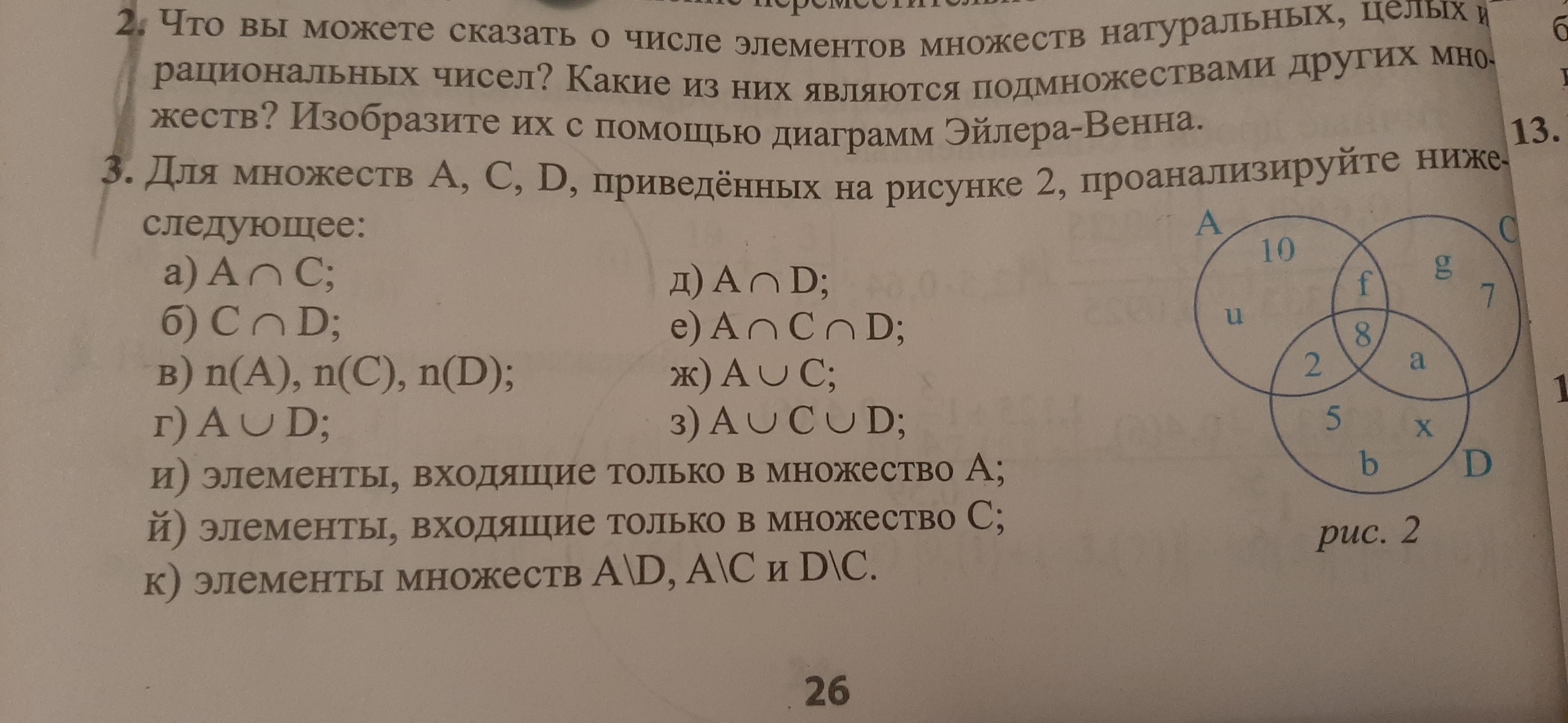 г) A∪D={2; 8; 10; f; u; 5; a; b; x} д) A∩D={2; 8} е) A∩C∩D={8}