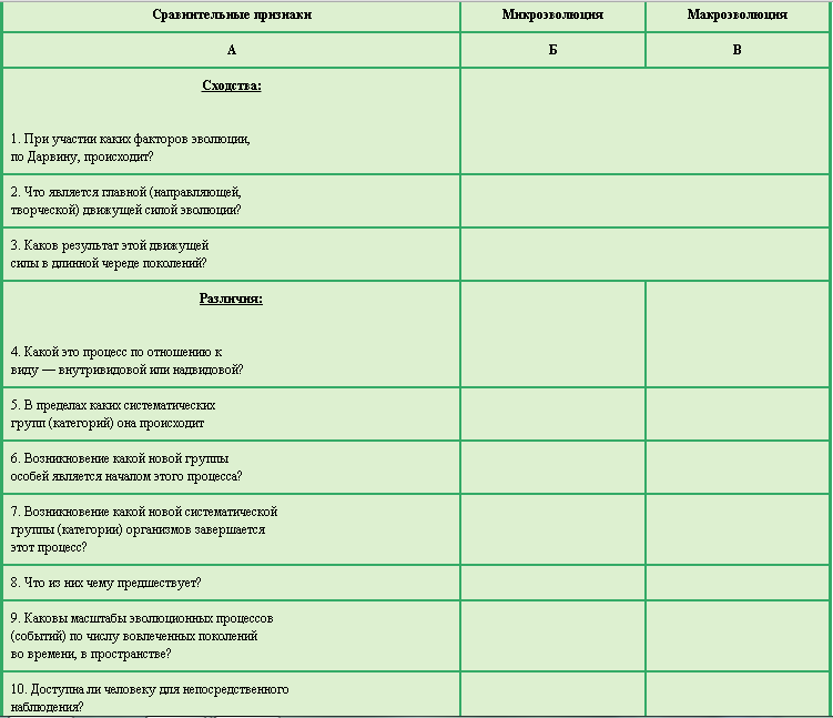 1. Сравните два процесса — макроэволюцию и микроэволюцию. Результаты внесите в таблицу