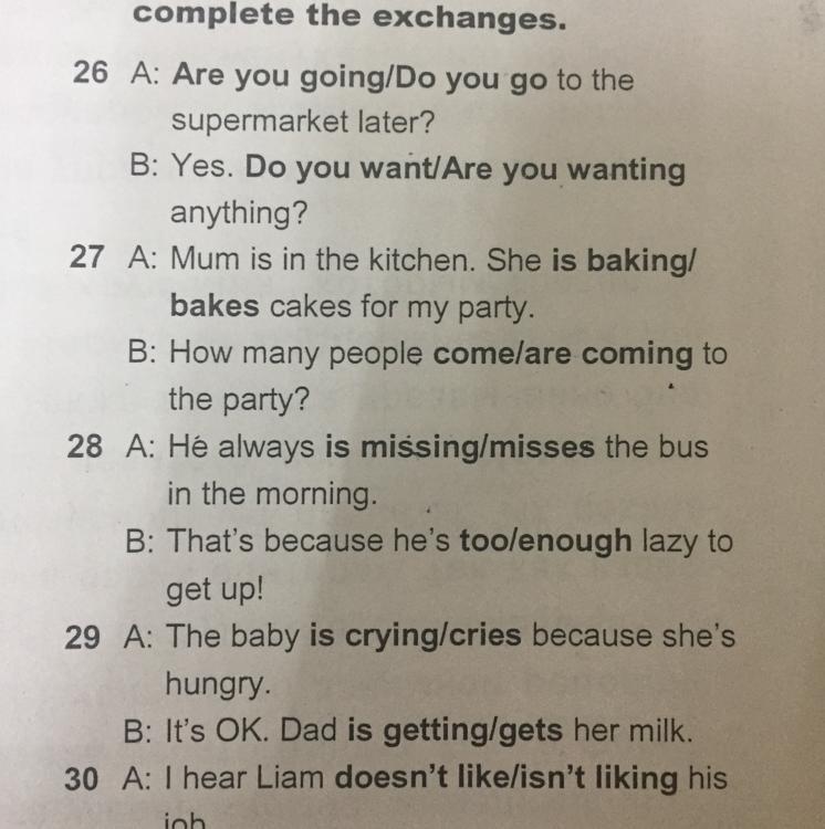 Ответ: Do you go, do you want, baking, come, misses, enough,crying,getting,isn't liking
