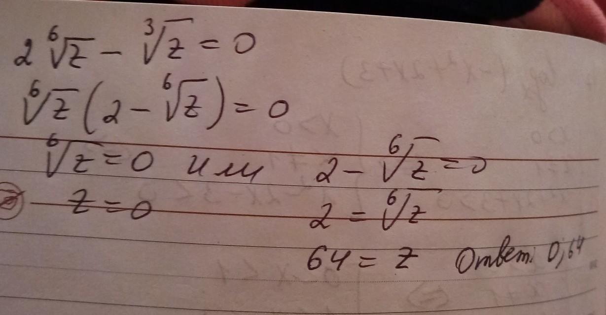 Найди корни уравнения:![2\sqrt[6]{z} -\sqrt[3]{z} =0 2\sqrt[6]{z} -\sqrt[3]{z} =0](https://tex.z-dn.net/?f=2%5Csqrt%5B6%5D%7Bz%7D+-%5Csqrt%5B3%5D%7Bz%7D+%3D0)