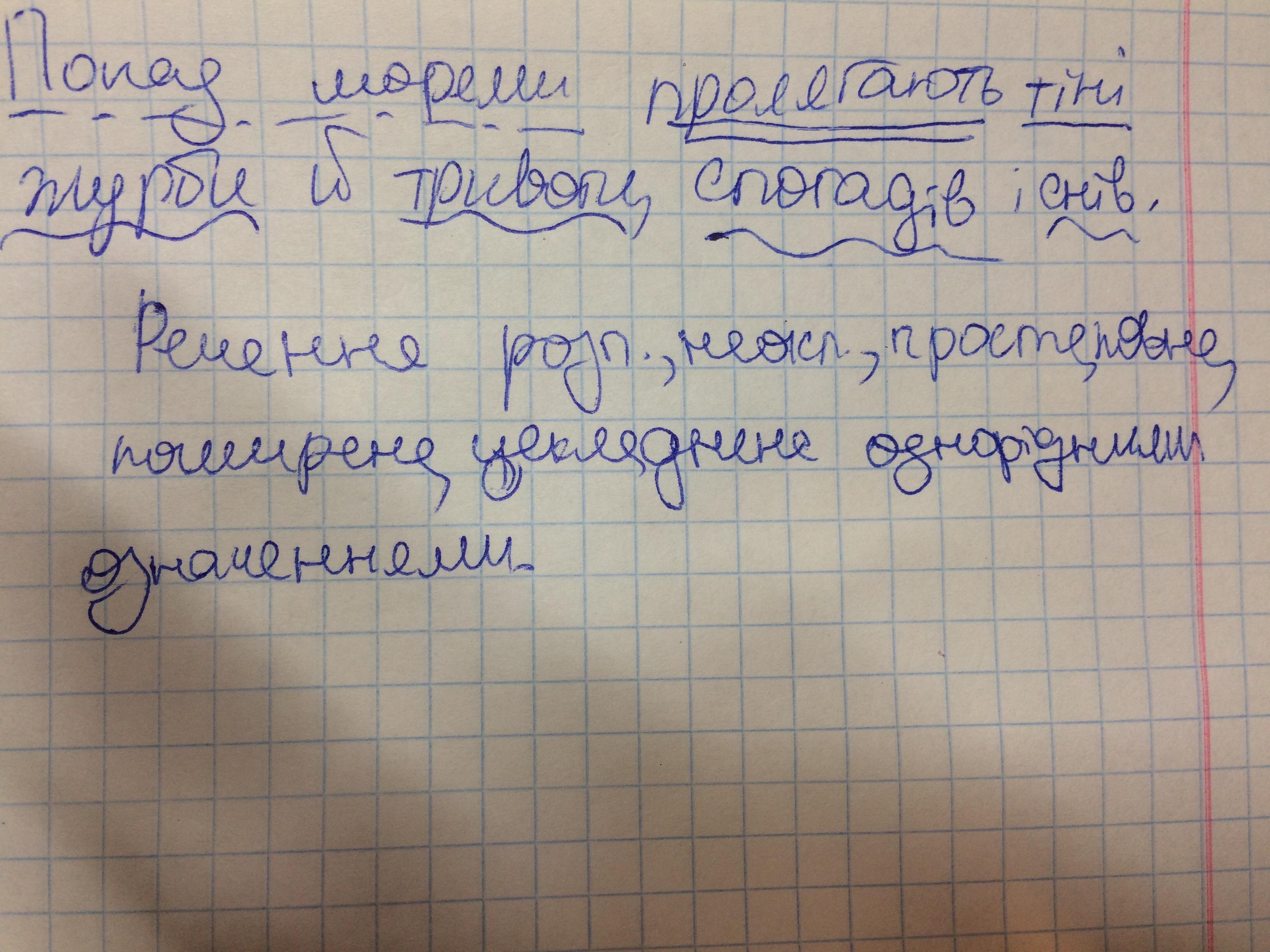 Зробити синтаксичний розбір речення та проаналізувати його за прикріпленою схемою (Понад морями пролягають тіні журби й тривоги, спогадів і снів.)