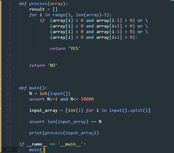 Необходимо вывести слово YES, если существует пара соседних элементов с одинаковыми знаками. В противном случае следует вывести слово NO.