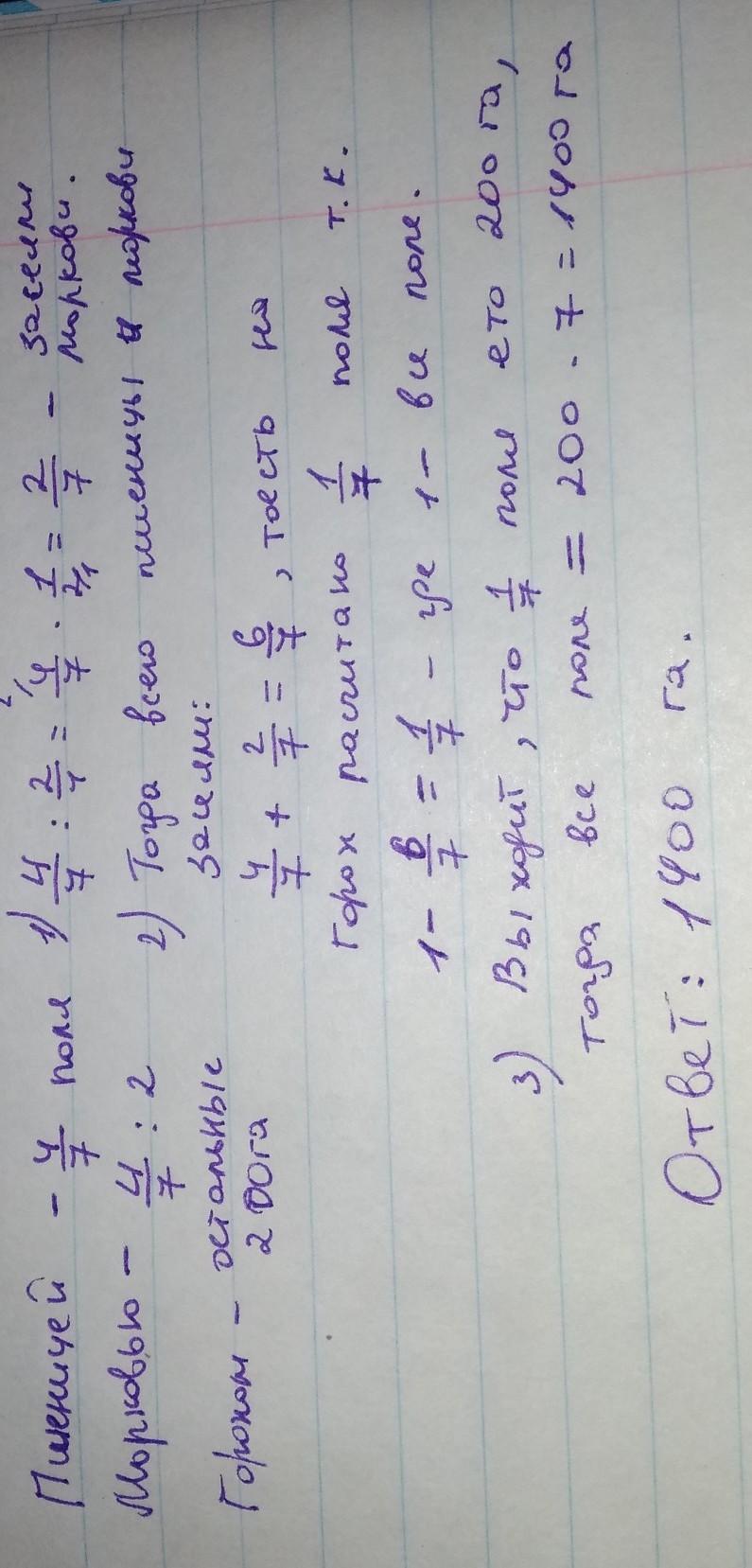 Поле засеяли пшеницей,морковью и горохом.Пшеницей засеяли 4/7 всего поля,морковью в 2 раза меньше ,чем пшеницей.Остальное поле засеяли горохом -200 га.Какова площадь всего поля?