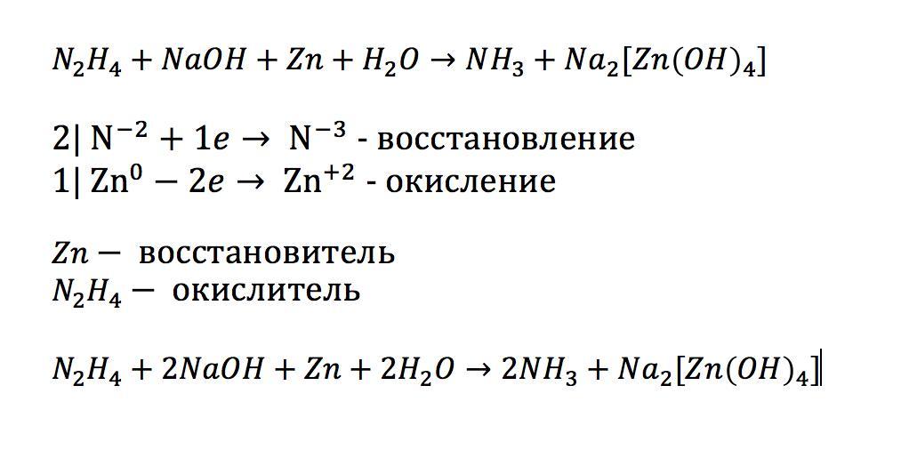 N2H4 + 2NaOH + 4Zn + 2H2O = 2NH3 + Na2[Zn(OH)]4