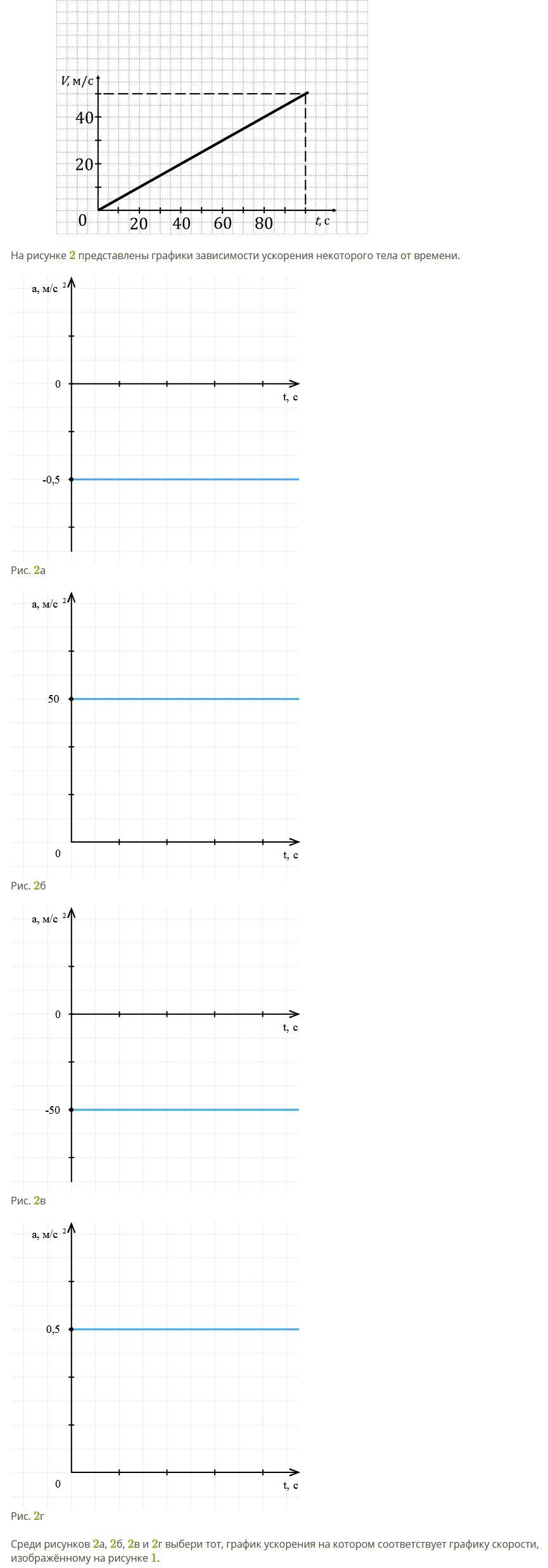 Среди рисунков 2а, 2б, 2в и 2г выбери тот, график ускорения на котором соответствует графику скорости, изображённому на рисунке 1.