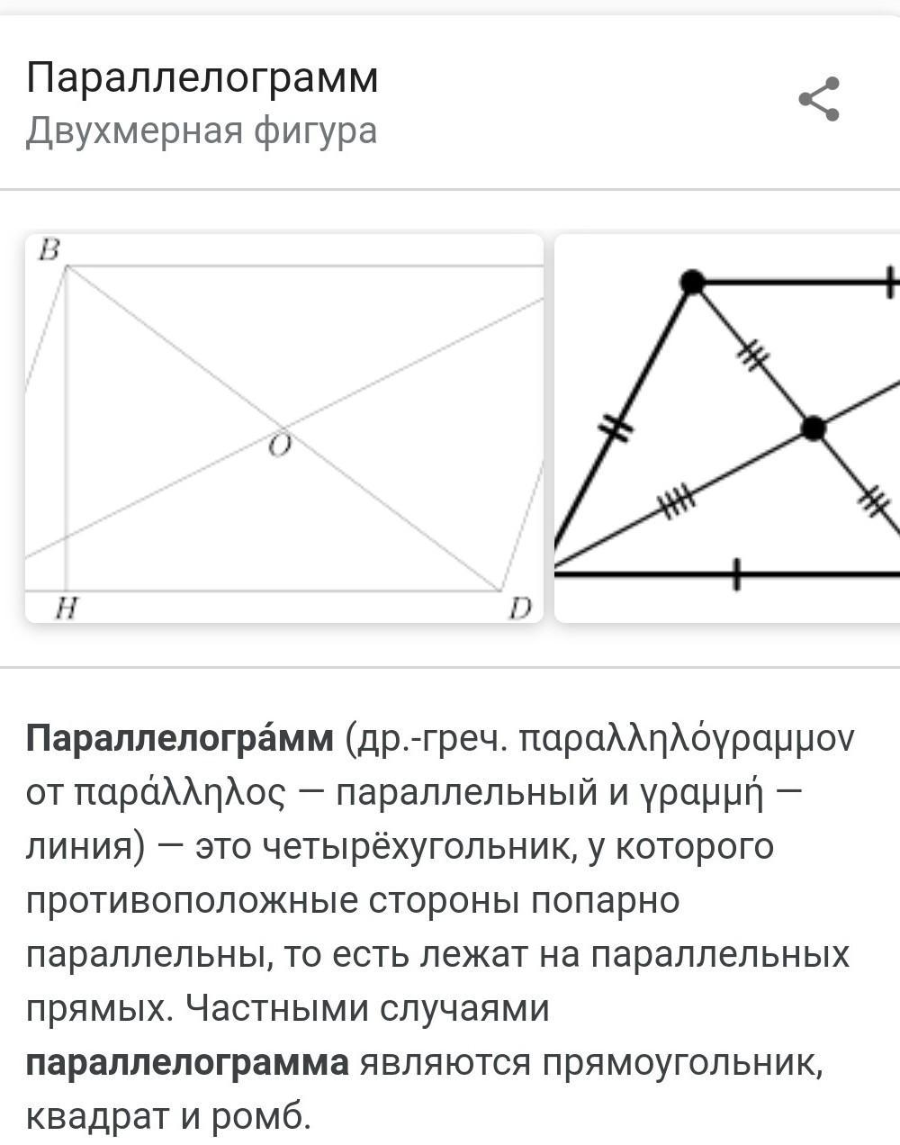 Параллелогра́мм — это четырехугольник, у которого противоположные стороны параллельны, то есть лежат на параллельных прямых. Частными случаями параллелограмма являются прямоугольник, квадрат и ромб