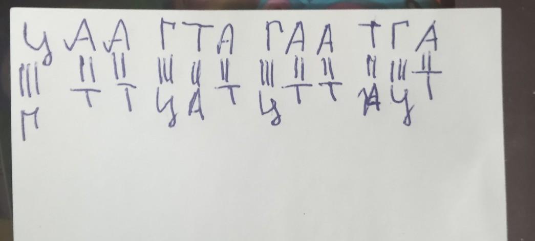 В фрагменте правой цепи молекулы ДНК нуклеотиды расположены в такой последовательности :ЦАА ГТА ГАА ТГАПостройте схему двухцепочечной молекулы ДНК