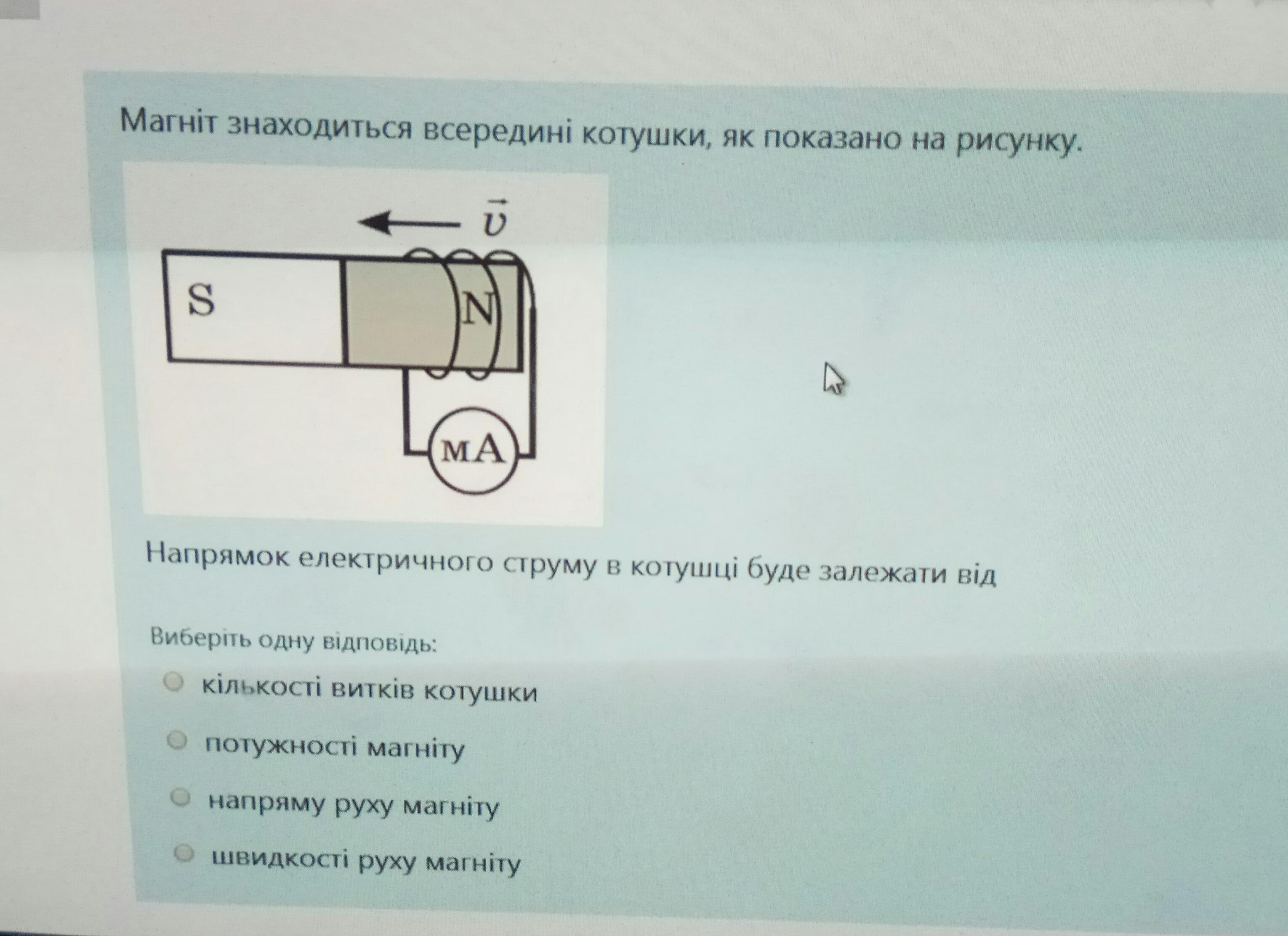 Магнит находится в середине катушки, как показано на рисунке. Направление электрического тока в катушке будет зависеть от : количества оборотов катушки; от мощности магнита; от направления движения магнита или от скорости движения магнита? Один вариант правильный