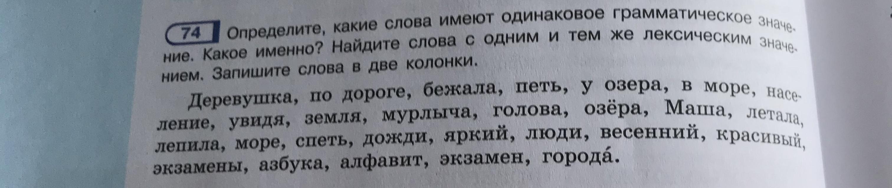 Слова, окончания которых имеют одинаковое грамматическое значение: деревушка — голова — Маша — азбука (сущ. 1 скл. и.п.); петь — лепить — спеть (инфинитив); весенний — яркий (прилаг. м.р., ед.ч.): лю ди — дожди (сущ. мн.ч., им.п.); озера — города (сущ. мн.ч.); алфавит — эк замен (суш. 2 скл., им.п.).