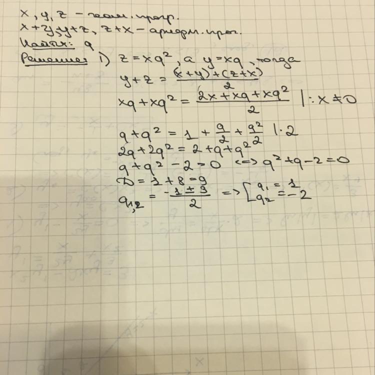 Числа x, y, z в указанном порядке образуют геометрическую прогрессию, а числа x+y, y+z, z+x в указанном порядке образуют арифметическую прогрессию. Найдите знаменатель геометрической прогрессии.