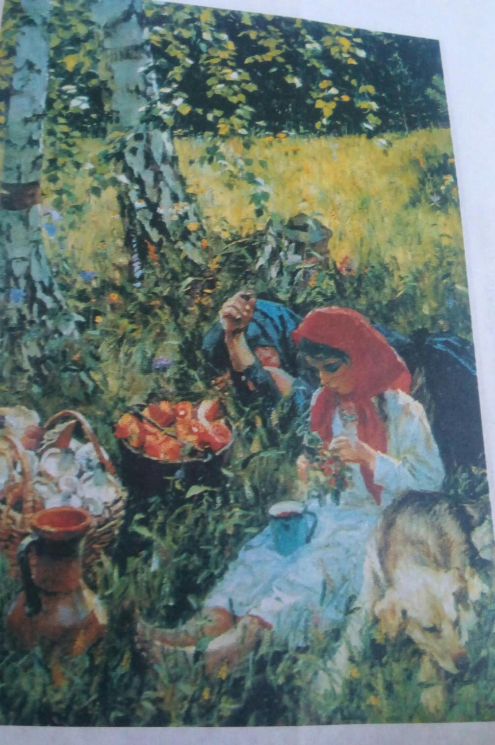 Произведение словно излучает тепло и свет. В глубине картины темнеет богатый и красивый русский лес. Удивительно правдоподобно автор картины передал ощущение знойного дня и усталость деревенских жителей.