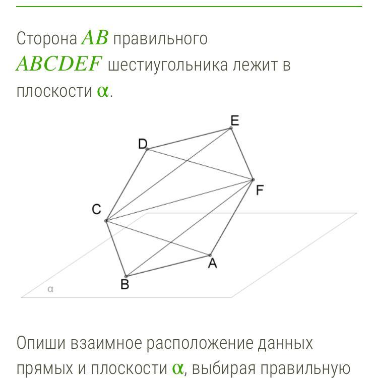 Только ОДНА сторона АВ лежит в плоскости α, все другие стороны - весь шестиугольник ABCDEF лежит в другой плоскости β.