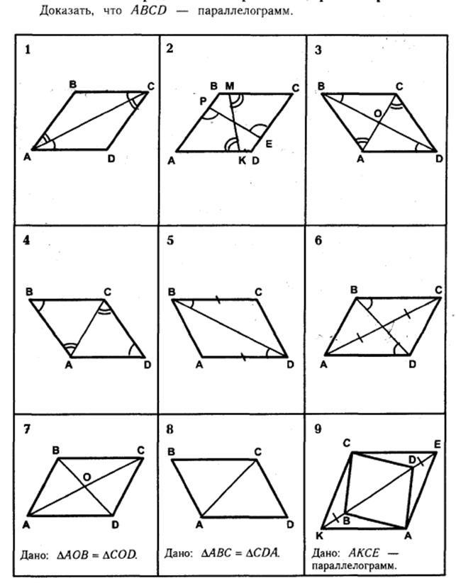 2)Т.к накрест лежащие углы при паралельных. отрезках АБ и СД равны,след-но стороны паралельны, это параллелограмм (по 3 признаку)