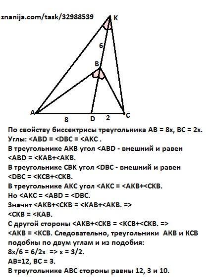 По свойству биссектрисы угла треугольника АВ = 8х, ВС = 2х.
