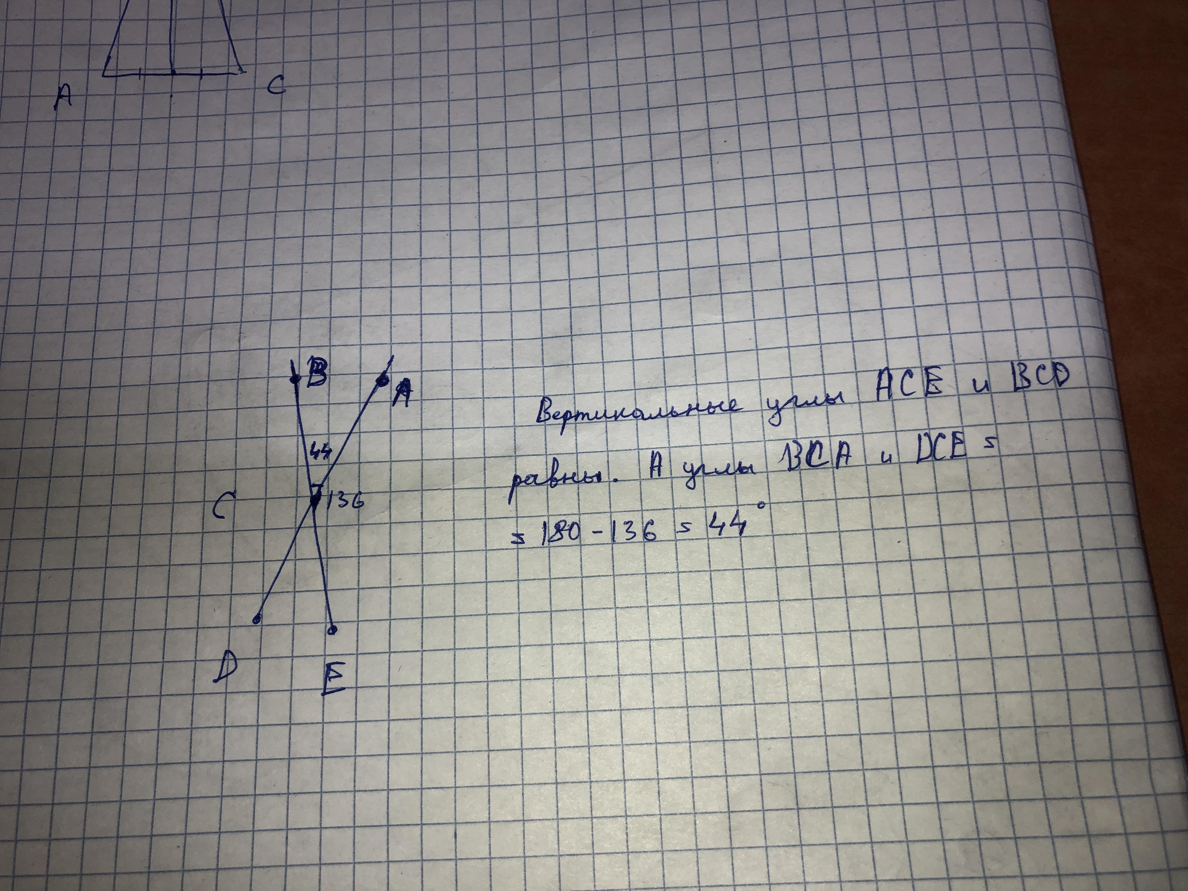Вертикальные углы ACE и BCD равны. А углы BCA и DCE = 180 - 136 = 44
