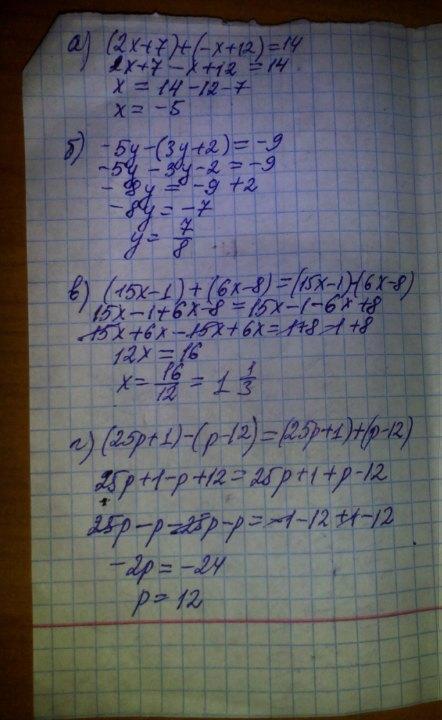 а) сумма выражений 2х+7 и -х + 12 равна 14;