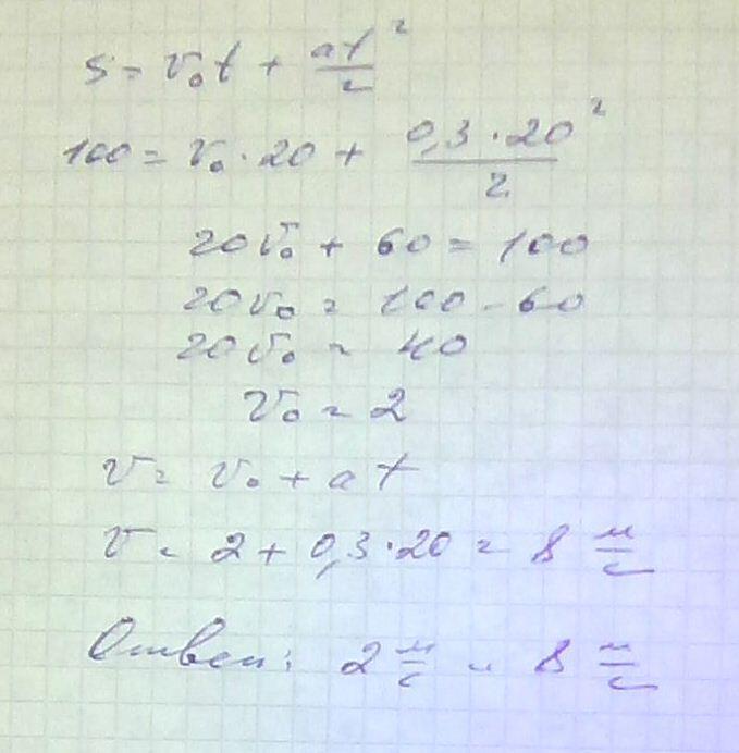 s=100 м t=20 c a=0.3 м/с² v=? vo=?