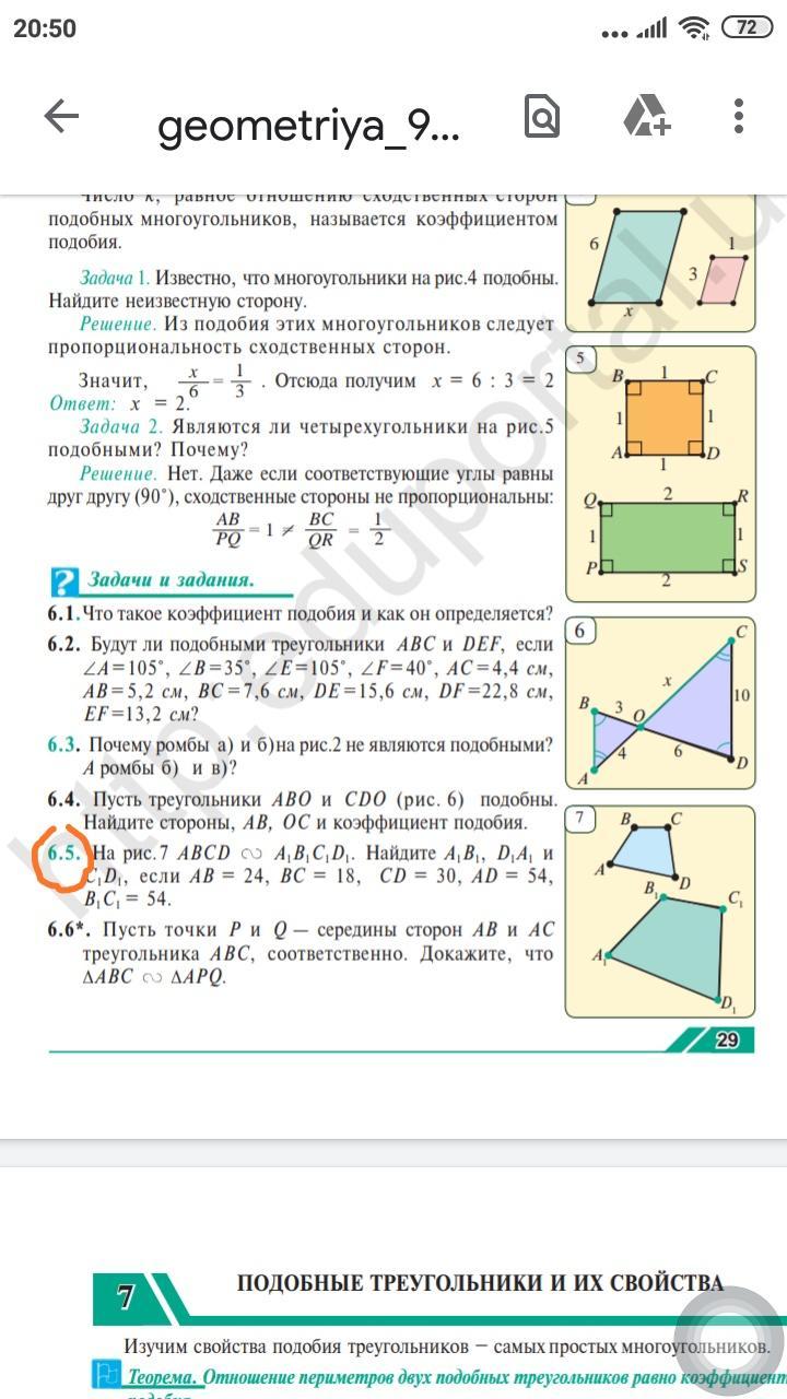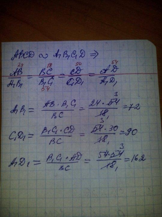 Т.к. четырехугольники подобны и В₁С₁/ВС=54/18=3- коэффициент подобия, достаточно длины указанных отрезков меньшего четырехугольника увеличить в три раза, значит, А₁В₁=3*24=72; А₁D₁=54*3=162; С₁D₁/=30*3=90