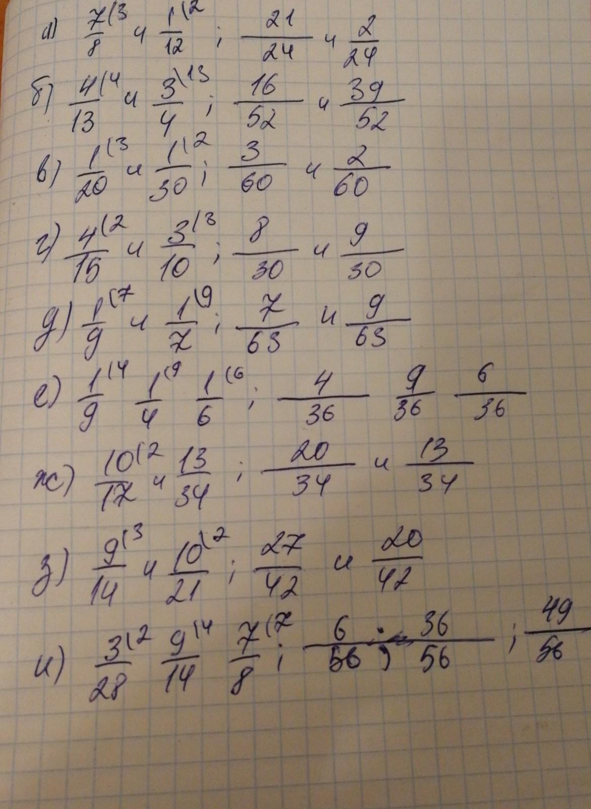 Приведите дроби к наименьшему общему знаменателю :а)7/8 и 1/12 б)4/13 и 3/4 в)1 /20 и 1/30 г)4/15 и 3/10 д)1/9 и 1/7 е)1/9,1/4 и 1/6 ж)10/17 и 13/34 з)9/14