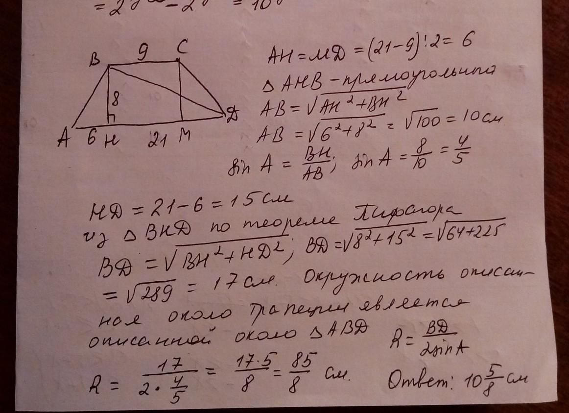 осови рівнобічної прапеції = 9 см і 21 см а висота = 8 см . знайдіть радіус кола описаного навколо тапеції пожалуста мне надо сечас