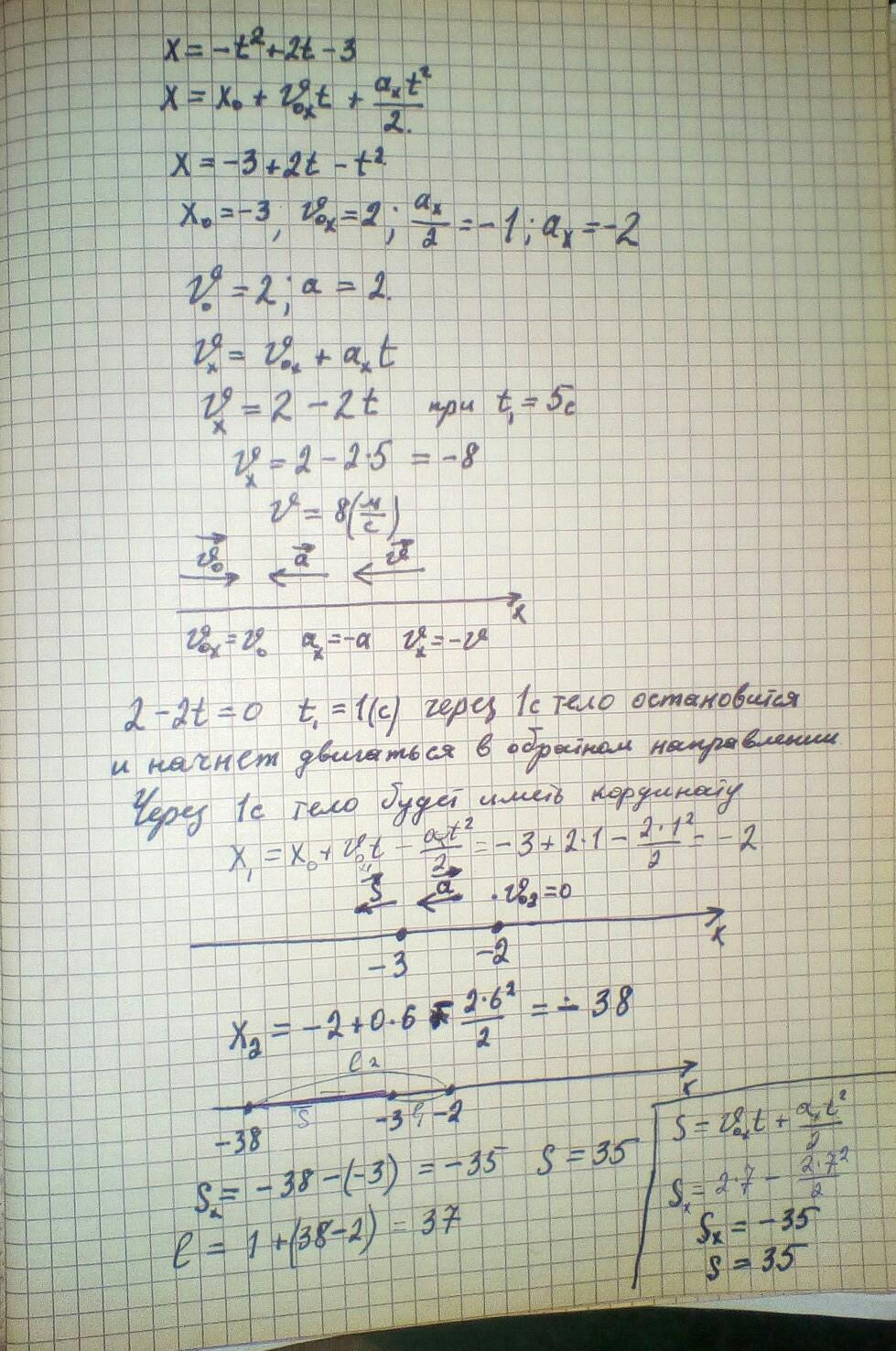 Задано уравнение движения тела x=-t^2+2t-3. Определить скорость тела через 5с.