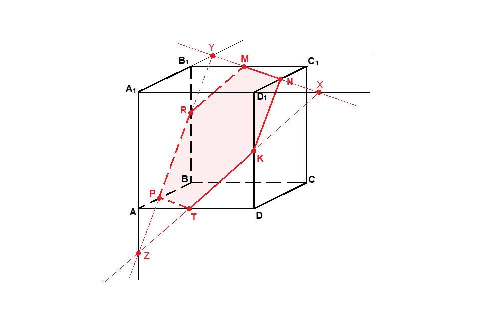 дан куб abcda1b1c1d1 точки m n k середины рёбер b1c1, c1d1, dd1 соответственно, побудуйте переріз кубу площиною (mnk).