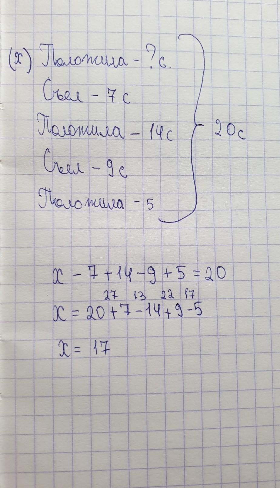 1 способ 1) 20-5 %3D 15 слив было в тарелке до ужина. 2) 15+9 %3D 24 сливы были в тарелке до того, как между обедом и удином Деня съел 9 слив. 3) 24-14 %3D 1О слив было до того, как сама после обеда положила 14 слив. 4) 10+7 3 17 слив было до того, как Деня между завтраком и обедом съел 7 слив. Ответ: было 17 слив. 2 способ. Все, что клала мама прибавляем, все, что съел Женя, отнимаем. Пусть х слив было на тарелке Изначально. х-7+14 - 9 + 5%3 20 х 3D 20 + 16 - 19 х 3D 20-3 х 3 17 слив было в тарелк