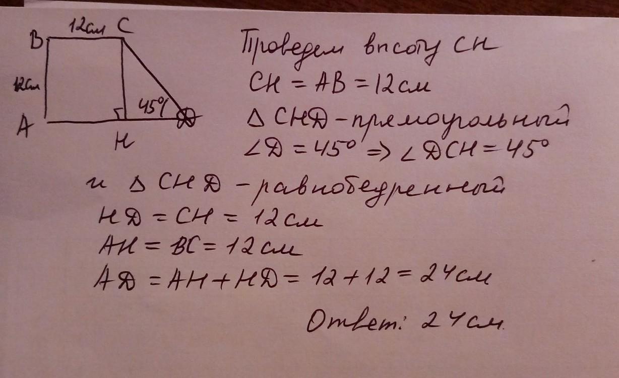 Найдите большее основание прямоугольной трапеции, если один из ее углов равен 45 градусов, меньшее основание равно меньшей боковой стороне и равно 12 см.