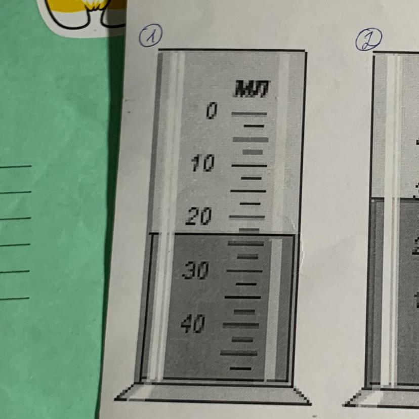 Ответ: 1 деление - 2,5 миллилитра. Объём цилиндра равен 50 мл.