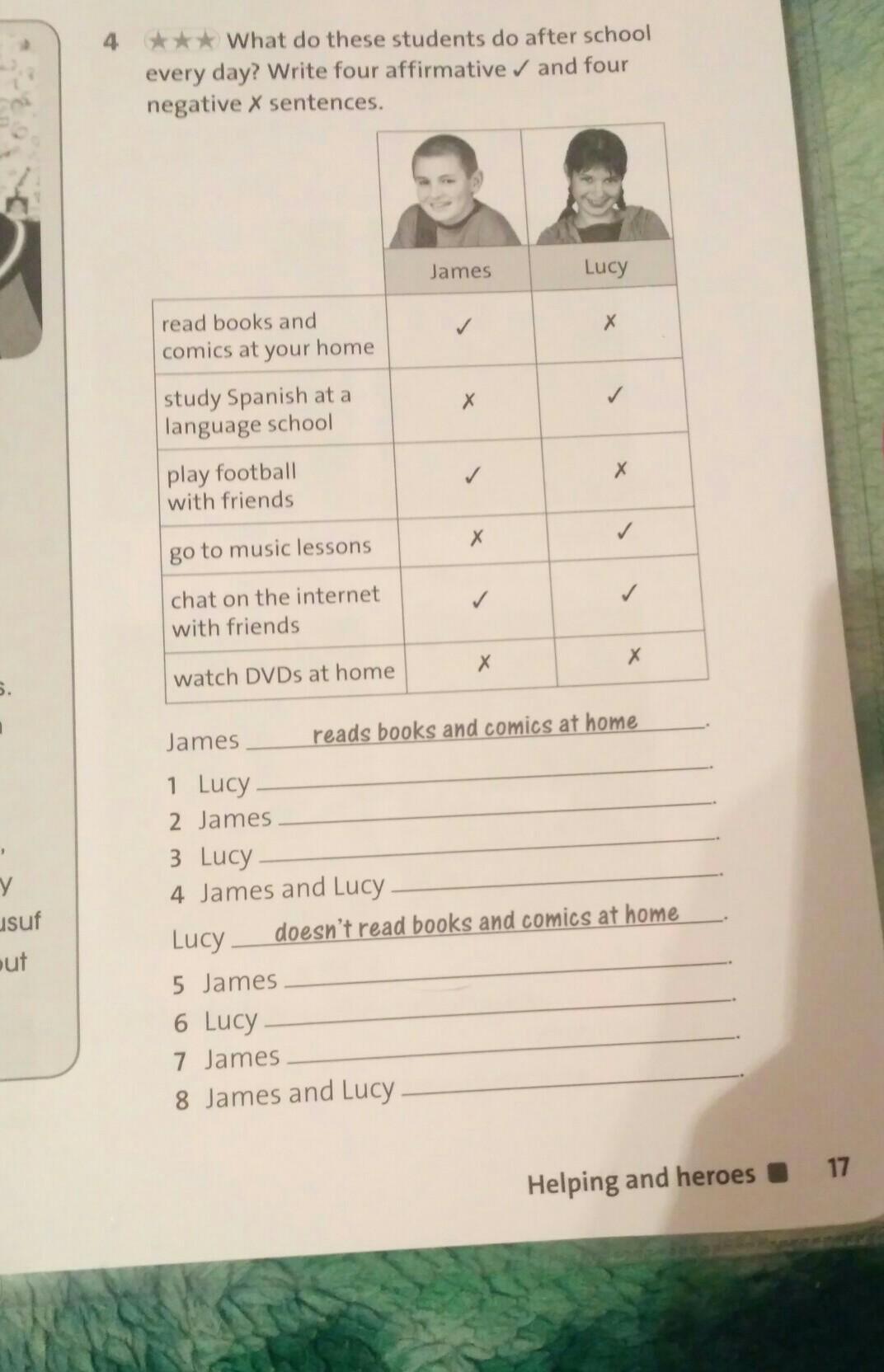 James doesn't study Spanish at a language school. Lucy doesn't play football with friends. James doesn't go to music lessons. Lucy and James don't watch DVDs at home.